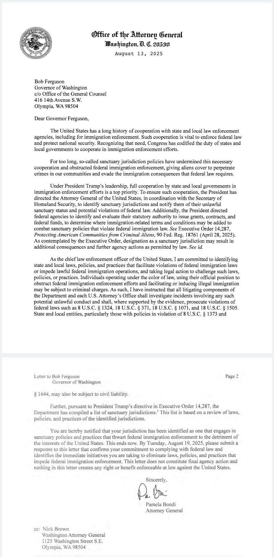 U.S. Attorney General Pam Bondi sent a letter to WA Governor Bob Ferguson, demanding that the state end its sanctuary policies by August 19, 2025, or face the loss of federal funding and potential criminal lawsuits.