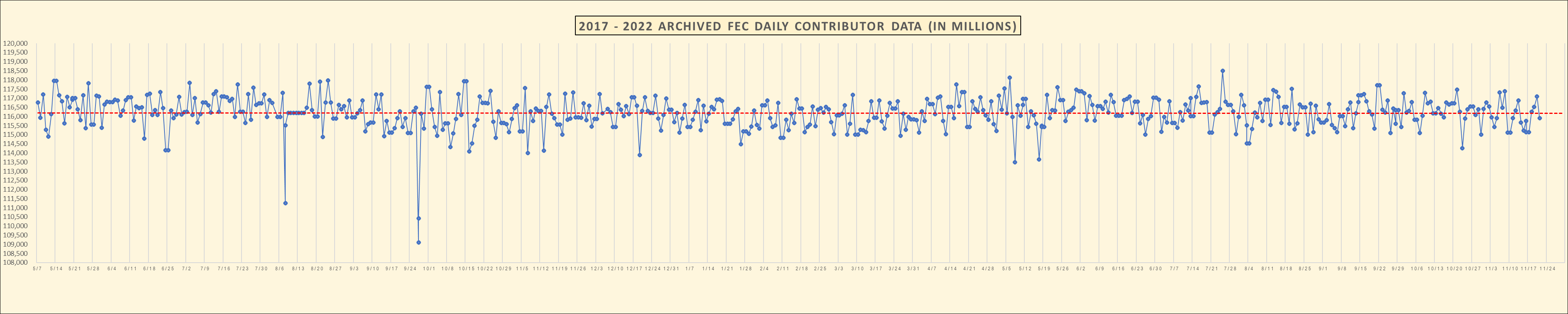 When we track, plot, and graph the data changes, there is a mean average of about 116,184,000 individual contributions for years 2017-2022.