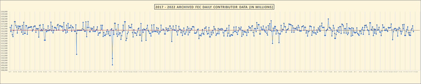 Currently (for those past years) the high mark is July 25, 2024, where there were 118,488,000 reported campaign contributions. The low mark is Sept. 27, 2023, where there were 109,096,000 reported campaign contributions.