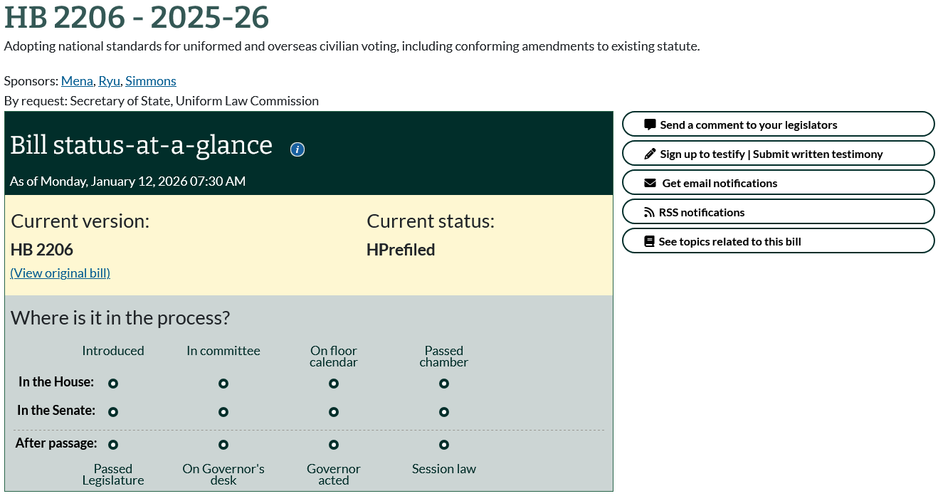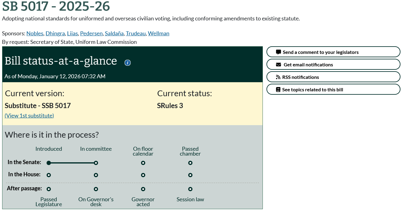 The proposed law mirrors a companion bill currently in the State Senate Rules Committee, SSB 5017. Either of these bills could create troubling new state voting rules pertaining to the Uniform Military and Overseas Voter Act (UMOVA) and the Uniformed and Overseas Citizens Absentee Voting Act (UOCAVA).